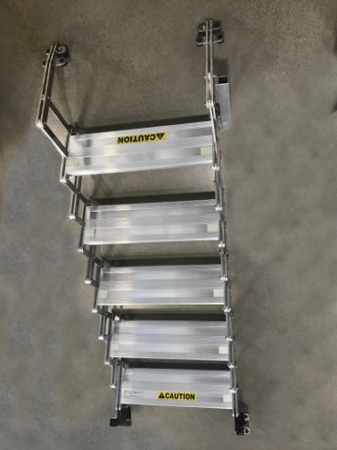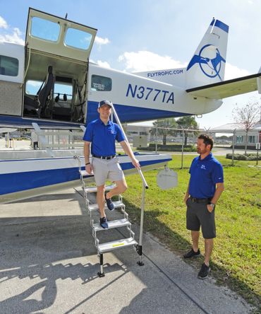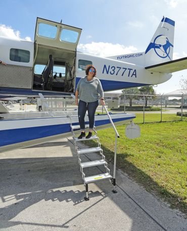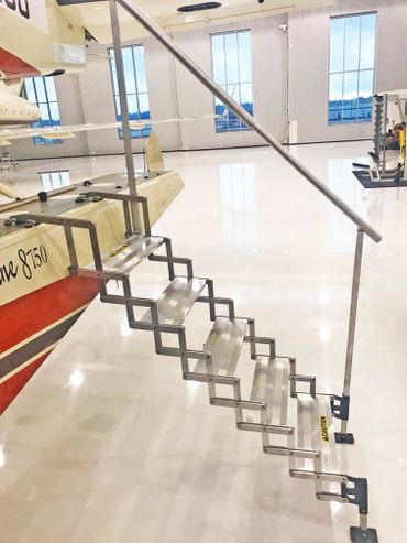 In five minutes, you can retrieve the steps from the well, unfold them, drop the top brackets into the two plug holes on the float, and simply walk off your aircraft. Just like walking down your stairs at home!